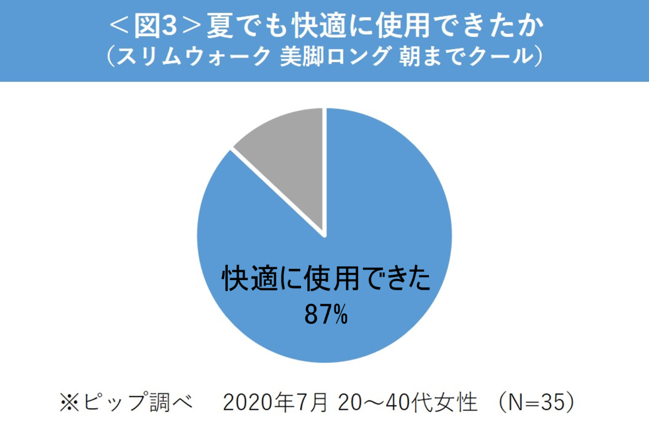 「スリムウォーク美脚ロング 朝までクール」のモニター調査では、約9割の方が夏でも快適に使用できたと回答し、高評価を獲得した。また、「スリムウォーク美尻&骨盤スパッツ 朝までクール」に対しても、「朝方目が覚めても、ひんやり感は持続していた。」などの声をいただき、夏に向けて需要が見込める製品であることが分かった。