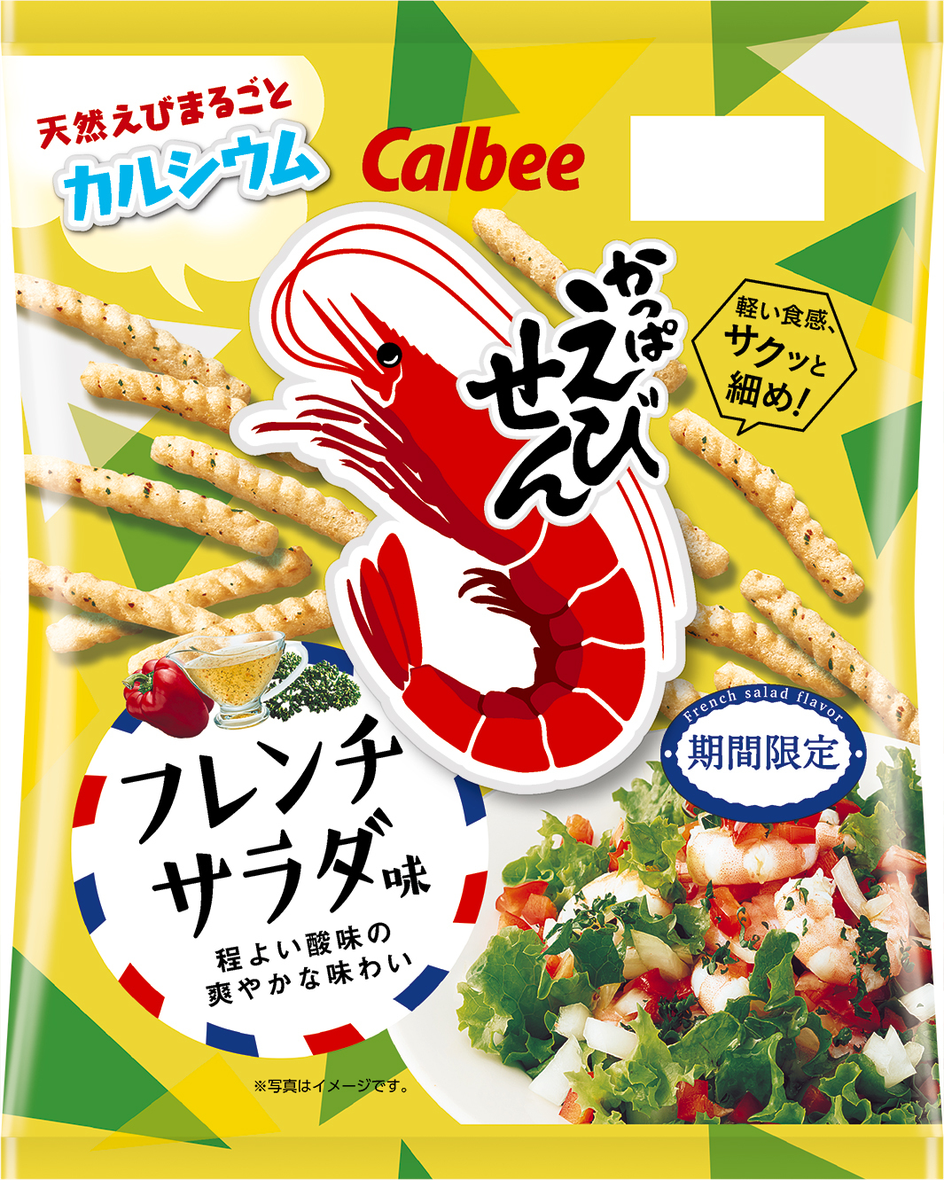 • フレンチサラダらしい程よい酸味と香味野菜の風味が後引く、 初夏にピッタリの爽やかな味わいの「かっぱえびせん」。 軽い食感が楽しめるように、 通常の「かっぱえびせん」より細めの生地に仕上げた。