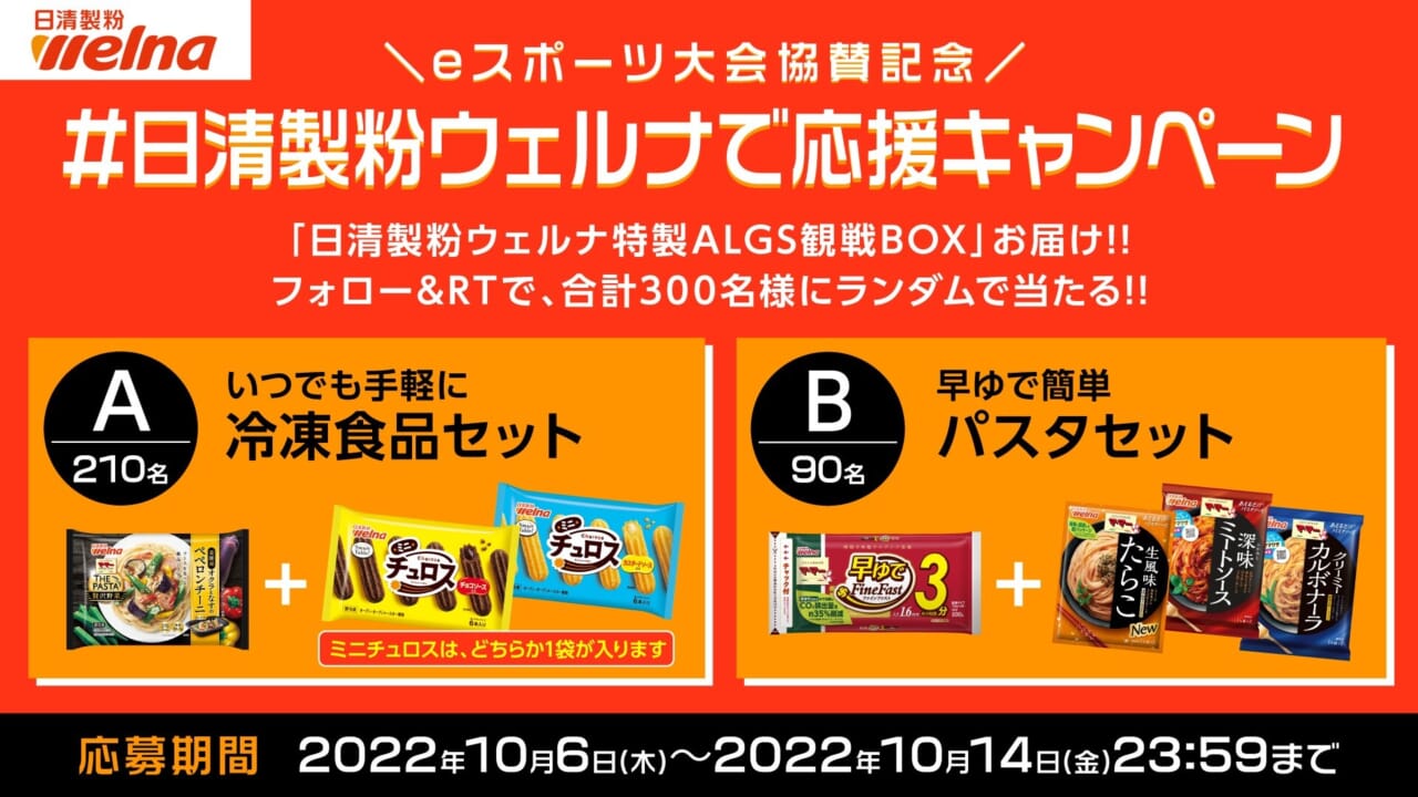 当社は本大会への協賛を記念し、当社公式Twitter アカウントをフォローして応募できるキャンペーンを、2回にわたり実施する。観戦時におすすめしたい「簡便」や「健康」ニーズを捉えた当社製品が入った「日清製粉ウェルナ特製ALGS観戦BOX」を、抽選で400名様(2回計)にプレゼントする。