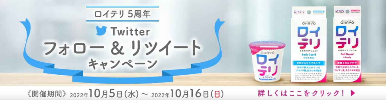 ロイテリ公式 Twitterにて、5周年記念フォロー&リツイートキャンペーンを開始した。 期間中にロイテリ公式アカウントをフォローし、「 #ロイテリプレゼント CP」 の入った対象のキャンペーン ツイートをリツイートすると、抽選で 10/5(水 )~10/9(日)は「ロイテリヨーグルト 8個入」が 10名様に、10/10(月)~ 10/16(日)は「ロイテリ 乳酸菌サプリメント お 試 し “3種 ”セット」 が 10名様に当 たる。