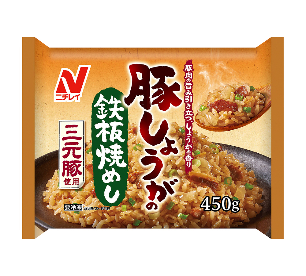 現在、「女性・高齢者の就業率の高まり」や「世帯の少人数化、単独世帯の増加」などの中長期的な社会構造変化から、家庭内での炊飯機会や手作り機会が減少し、簡便調理で喫食可能な家庭用冷凍米飯の需要が高まりを見せている。また、一般に夏場は、家庭用冷凍米飯の需要が高まるため、ニチレイフーズでは、白米と食べ合わせが良く、食卓出現頻度の高い人気メニューである「豚の生姜焼き」に着目し、『豚しょうがの鉄板焼めし』を新発売する。