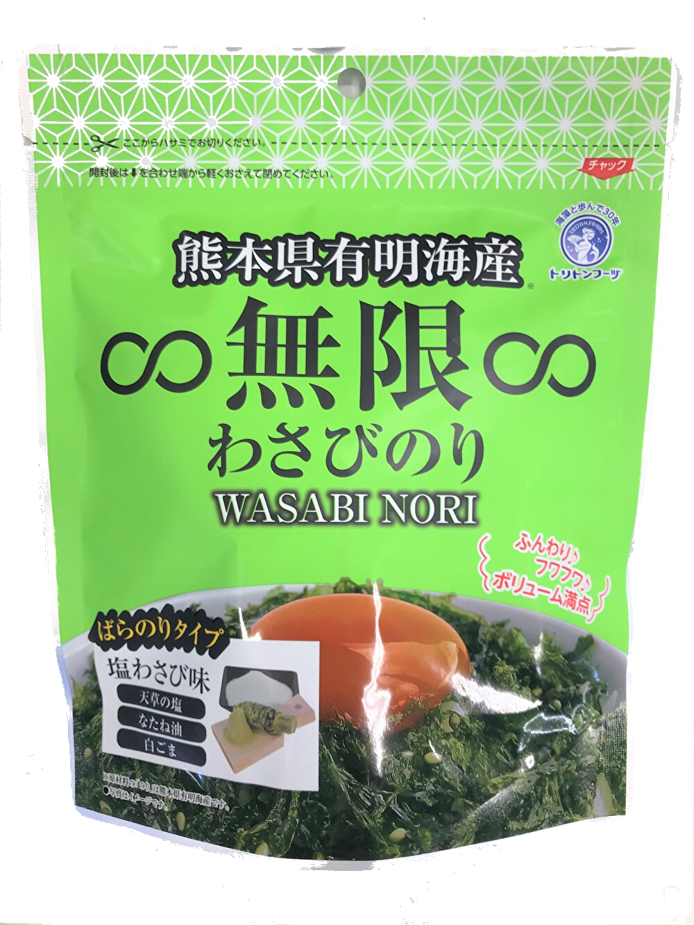 株式会社トリトンフーヅ(熊本県)は、発売以来人気の高い、風味豊かな熊本県有明海産ののりを100%使用した「∞無限∞のりシリーズ」に新たなフレーバーとして「∞無限∞わさびのり」を追加し、6月より数量限定発売する。