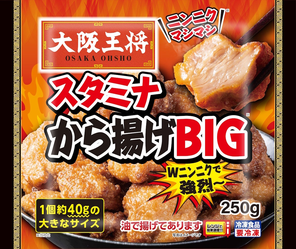 大阪王将のから揚げが、1個の食べ応えを十分に、使いやすい容量に。衣と鶏肉、両方にたっぷりとにんにくを使用。食欲そそるニンニク醤油味は、お弁当の一品ではなく、夕食のメインメニューとして活用でき、ごはんがススム一品。