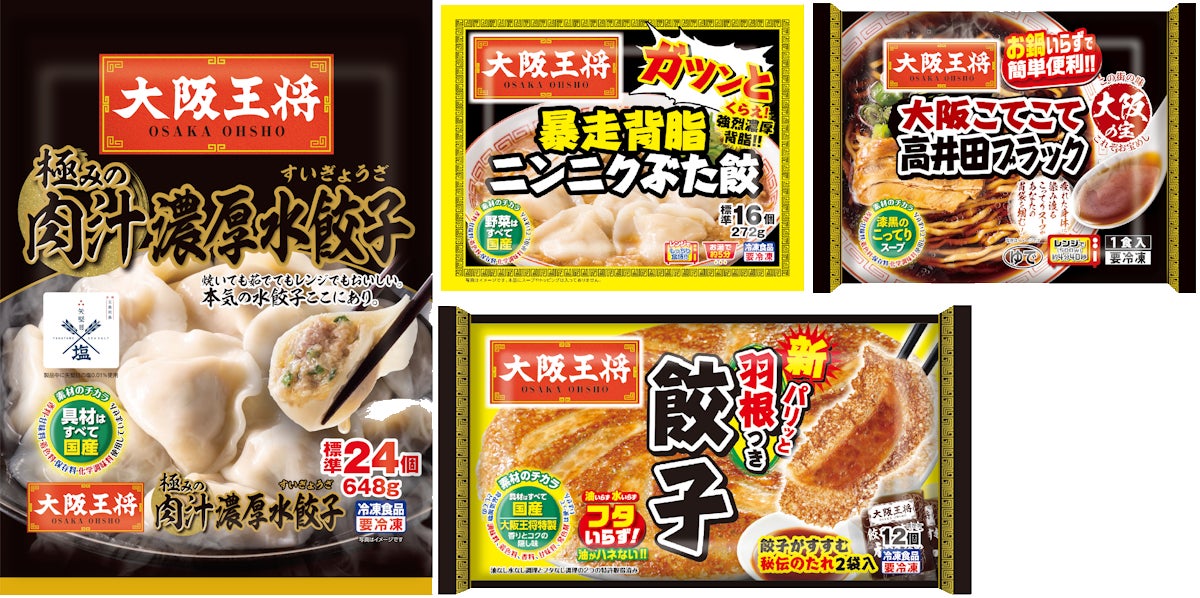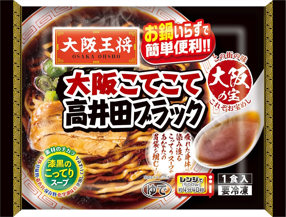 “高井田系”や“高井田ブラック”という名で戦後から東大阪市西部を中心に親しまれているご当地ラーメンを、冷凍ラーメンにした。真っ黒な醤油スープ、太麺、大きなチャーシューとたっぷりのネギ。2023年春夏に発売開始した真っ赤なスープ『宮崎辛麺』と並べれば“黒vs赤”。見た目も味も刺激の強い大阪王将冷凍ラーメンシリーズが登場した。