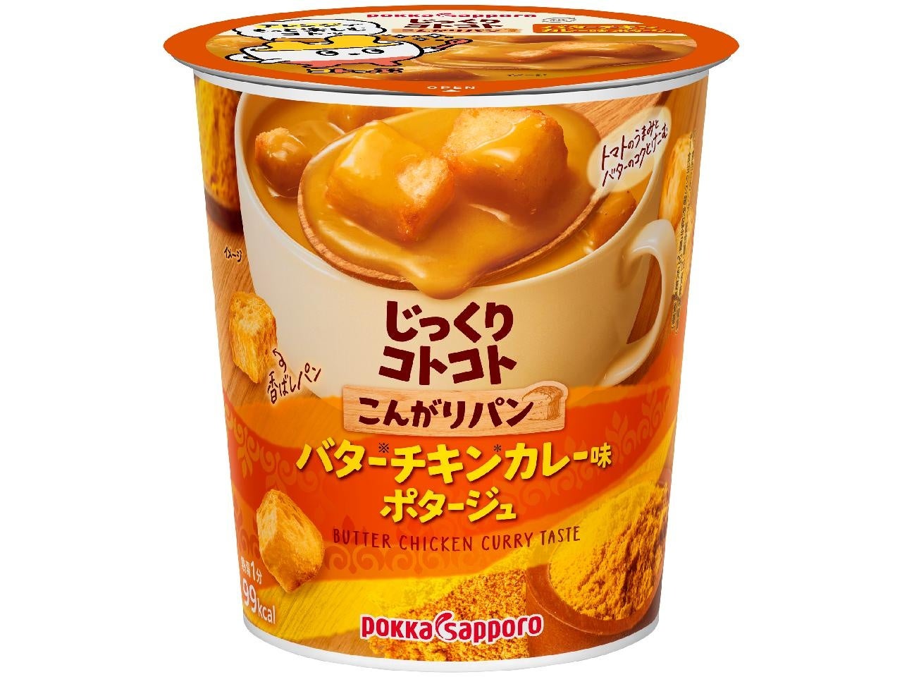 カップ入りスープでは、「じっくりコトコトこんがりパン バターチキンカレー味」を新発売。過去にも期間限定発売したこのフレーバーは、お客様の再販・定番化の要望も数多く寄せられていることに加え、主食との相性が良く、トッピングやアレンジをすることが定着しているカレーメニューとしてお好みのアレンジもできる。使用しているカレーパウダーには10種のスパイスを使用しており、バターチキンカレー味にふさわしい濃厚な味わいを楽しめる。