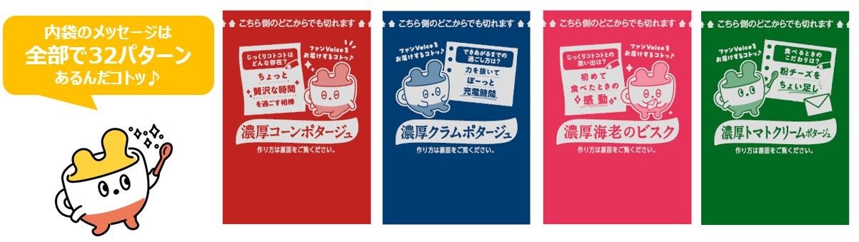 「濃厚クラムポタージュ」と「濃厚海老のビスク」には、特製野菜ブイヨンに真鯛の頭骨や中骨を加えた“特製野菜フィッシュブイヨン”を使用。パッケージには特製野菜ブイヨンのアイコンと、最大の特長である「素材まるごとのおいしさ」の文言を記載。中袋には「じっくりコトコトファンコミュニティ」※1のユーザーと共創した“じっくりコトコトとの思い出は?” “できあがるまでの過ごし方は?”などの質問に対する32のメッセージを、ブランドキャラクターの“コトっぷ”が紹介し、ファンとのつながりを強めていく。
