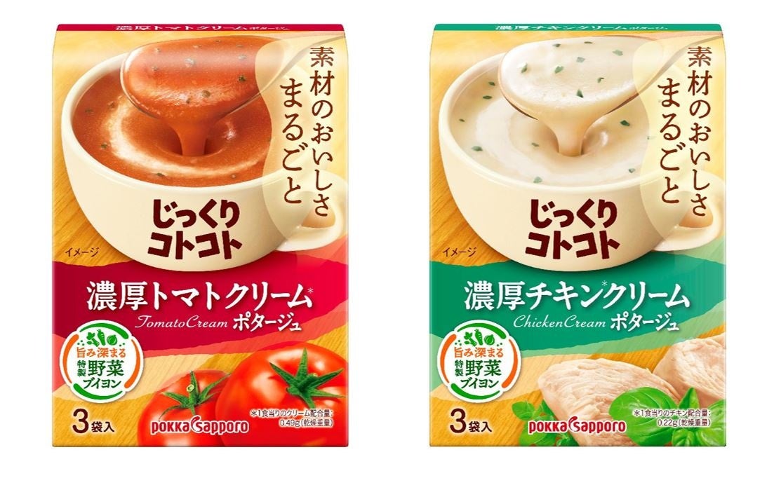 サッポロホールディングス(株)のグループ企業であるポッカサッポロフード&ビバレッジ株式会社(愛知県)は、2023年8月21日(月)より「じっくりコトコト」ブランドの箱入りスープから「濃厚トマトクリームポタージュ」と「濃厚チキンクリームポタージュ」の2アイテムをラインナップに追加し、6アイテムをリニューアル発売するとともに、カップ入りスープの「じっくりコトコトこんがりパン バターチキンカレー味」を新発売する。
