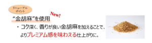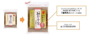 - 「 おかかふりかけ金胡麻入り 」の パッケージのリニューアル点 従来の商品からさらにプレミアム感をプラスしたデザインに変更した。