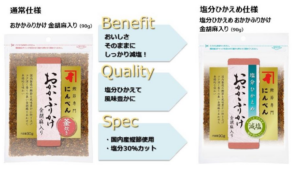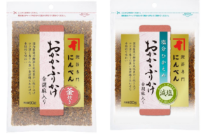 国内製造鰹節を使用し、醤油・砂糖等を加えて風味豊かに炊き上げたソフトタイプのふりかけに、コク深く、香りが良い“金胡麻”を加え プレミアム感あるふりかけにリニューアルした。 通常仕様と、塩分を通常より 30 %抑えた減塩仕様の 2 品のラインナップ。鰹節専門店だからこそ提供できる味わい深いおかかふりかけは、子どもから大人まで楽しめる。