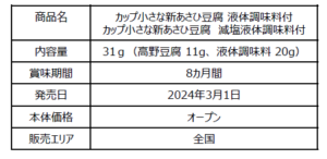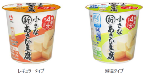旭松⾷品株式会社(大阪市)は、2024年3⽉1⽇より、即席タイプの「カップ⼩さな新あさひ⾖腐 液体調味料付」、「カップ⼩さな新あさひ⾖腐減塩液体調味料付」を全国発売する。⾼野⾖腐売上No.1商品※「⼩さな新あさひ⾖腐粉末調味料付」の味が⼿軽に⾷べられる。