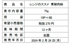 株式会社永谷園(東京都)は、必要な材料(2つ)を加えて、電子レンジで加熱するだけでおかずができあがる惣菜の素「レンジのススメ 青椒肉絲」(税抜270円)を2024年2月26日(月)より発売する。「レンジのススメ」シリーズは、下ごしらえや調理、片付けなど日々の小さな家事負担を軽減、さらに材料の準備から出来上がるまでのうちのおよそ半分の時間を“ほったらかし”にできるので、タイパ※1 の実感に加え、忙しい毎日の食事づくりで“あと一品欲しい時”に重宝する。“しょせんレンジでしょ”、“レンジだけではなんとなく失敗しそう”といった電子レンジ調理(以下、レンジ/レンジ調理)に対するマイナスイメージを払拭する、フライパン不要の新しい料理のカタチを叶えた、まさに「レンジのススメ」な商品だ。※1 タイパ:タイムパフォーマンスの略語で、使う時間に対する効果や満足度を指す