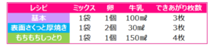 3.卵と牛乳の量を変えて食感・見た目アレンジ 卵と牛乳の量を変えるだけで、3つの焼き上がりレシピが選べる。