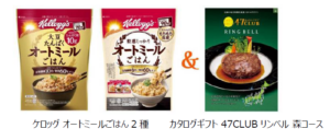 ・賞品 :ケロッグ オートミールごはん2種(大豆たんぱく オートミールごはん、粒感しっかり オートミールごはん)と「カタログギフト 47CLUB リンベル 森コース」