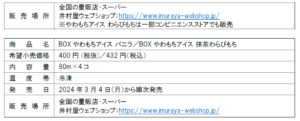 井村屋株式会社(三重県)は、アイスの人気ブランドである「やわもちアイスシリーズ」の『やわもちアイス バニラ』『やわもちアイス わらびもち』『BOXやわもちアイス バニラ』『BOXやわもちアイス 抹茶わらびもち』をリニューアルし、2024年3月4日(月)より順次発売する。