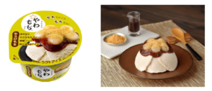 リニューアルポイント:カップタイプの『やわもちアイス わらびもち』同様、わらびもちの食感を生わらびもちのような、よりやわらかいもちぷる食感にした。また、黒みつソースを甘さ控えめにリニューアルした。