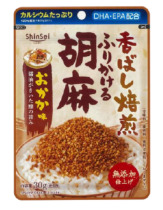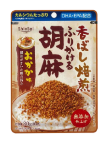 甘辛おかか味をつけた味ごま。優しい味わいなのでお子様にもオススメ。カルシウムたっぷり・DHA・EPA 配合。味付けに甘味料、 着色料 、 香料は使用していない。