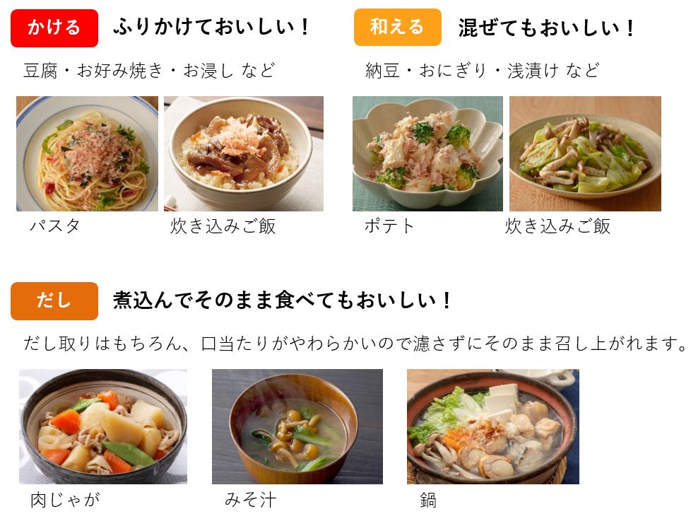 かける、和える、だしに使うなど、毎日のお料理に活躍する。