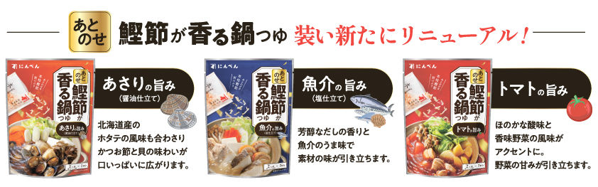 2022年、「だしアンバサダーと鍋つゆを作りたい」というにんべん家庭用事業部責任者の声から始まった共創プロジェクトで開発された鍋つゆシリーズである。開発の各段階でだしアンバサダーの意見を商品開発担当者にフィードバックすることで、より生活者に身近な商品開発を目指した。アイデアの募集からフレーバー投票、試食会、パッケージ投票を経て、だしアンバサダーの生の声をもとに、約1年かけて「あとのせ鰹節が香る鍋つゆシリーズ(あさりの旨み・魚介の旨み・トマトの旨み)」が完成した。2024年9月1日にパッケージデザインをリニューアルする。商品名やフレーバーが一目で分かるようにし、鍋のシズル写真の上から鰹節をかける様子を追加することで、鰹節をあとのせするコンセプトがより伝わりやすいデザインとなっている。