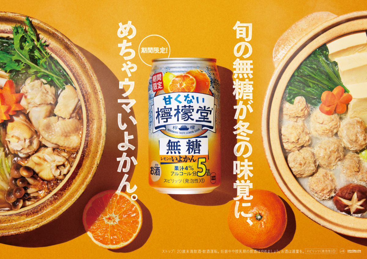 寒さが深まり、自宅で温かい料理や鍋物を囲む機会が増えるこの季節に、「甘くない檸檬堂 無糖レモンといよかん」で食卓に柑橘の豊かな香りを添え、心身ともに温まる贅沢な晩酌時間をぜひご賞味いただきたい。