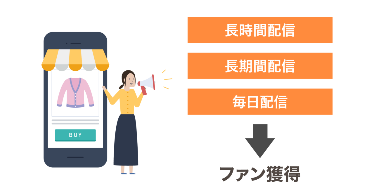 では、現在の日本におけるライブコマースはどのような状況なのでしょうか。ステイホームになって利用が増えているのが、「インスタライブ」などを活用し、長時間配信を行っている店舗です。たとえば、身長150cm未満の女性を対象としたD2Cアパレルが数百日間、毎日配信をしたことで多くのファンを獲得しました。とくにアパレル店舗などからの長時間配信が、現状最も多い成功パターンとされています。