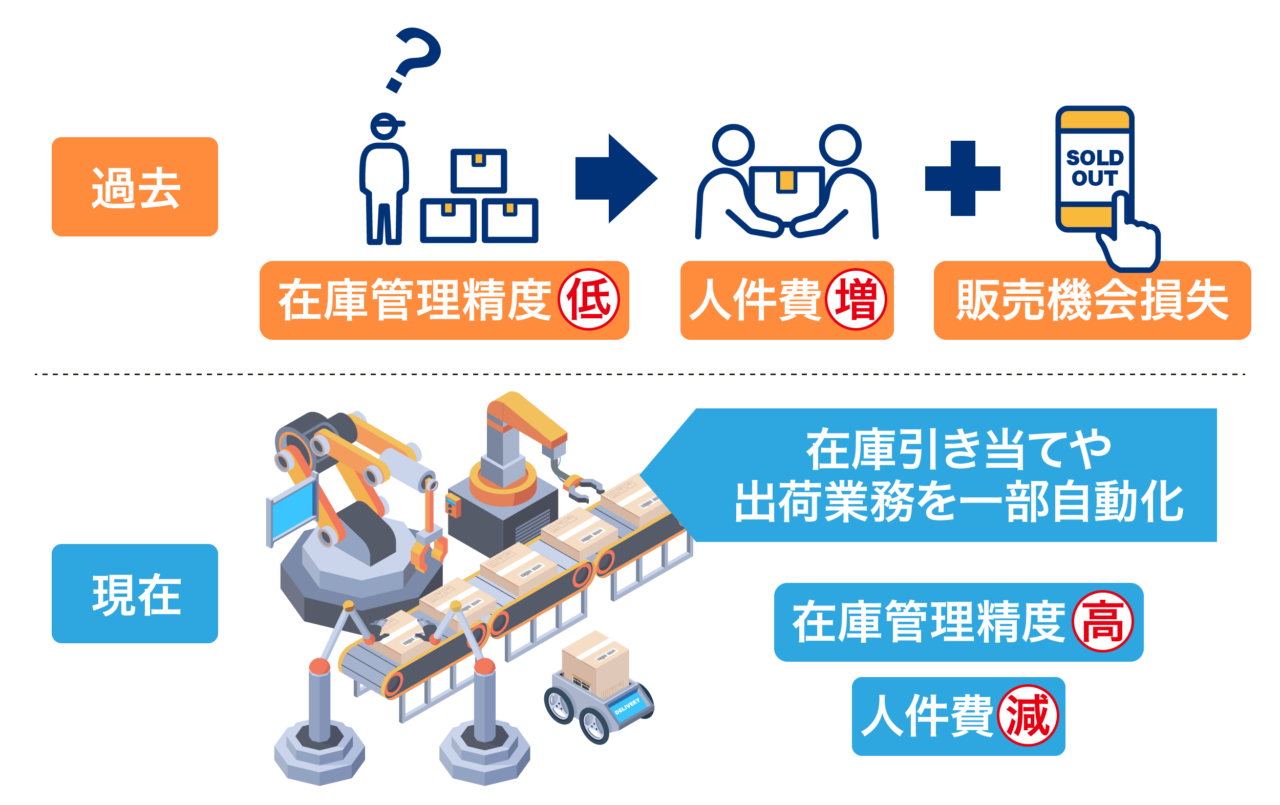 現在は、物流会社側が提供する在庫管理システムやそのほかのさまざまなシステムやの精度がかなり向上しています。倉庫内のオペレーションレベルも高まり、AI技術を活用して人手を介さずに自動で出荷できる状況も整ってきたため、拠点を分けるデメリットをほぼ解消することができるのです。
