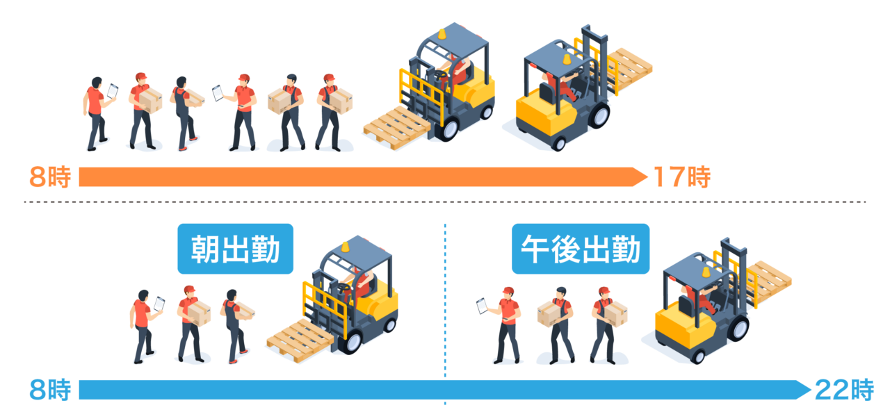 物流倉庫といえば、かつては一般的に8時や9時に出社し、5時や6時に倉庫が閉まるというのがスタンダードでした。しかし、弊社の物流センターは2部制を採用しており、朝出勤と午後出勤のスタッフで構成され、夜の10時まで標準で稼働しています。