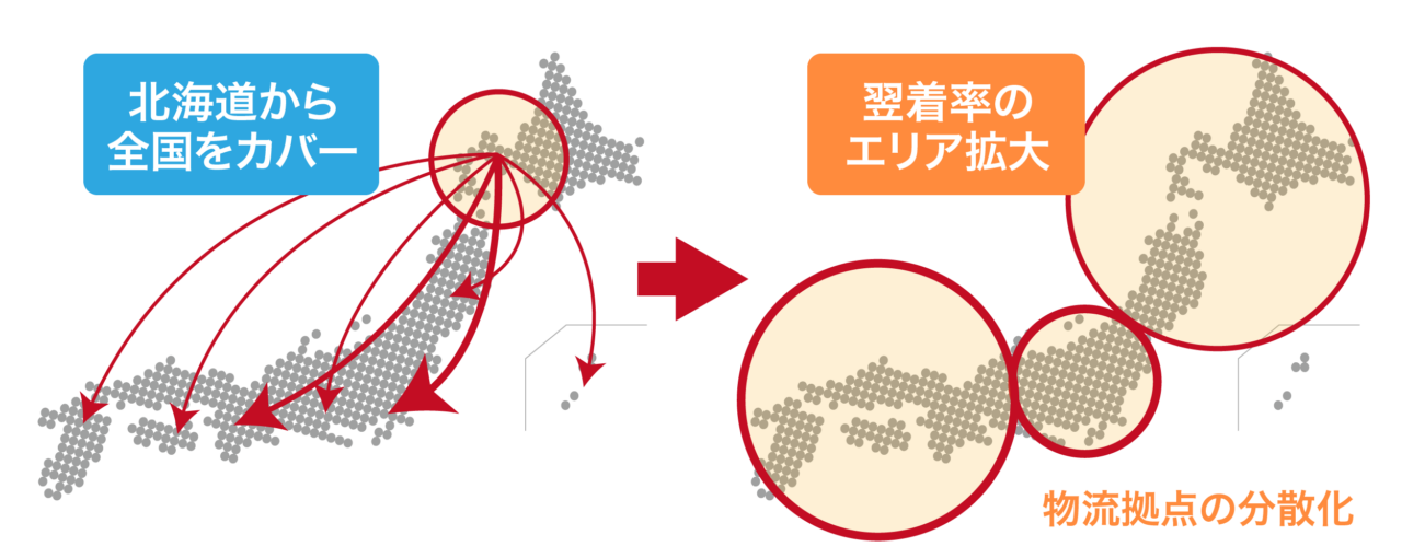 当社と半年以上会議を重ねた結果、これまで全国配送をカバーしていた従来の物流拠点は、北海道から東北までをカバーし、関東と関西に新たに物流拠点を持つ『物流拠点の分散化』を進めるという結論に至ったのです。