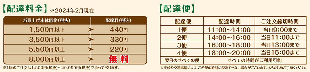 取り扱い品目は食料品、惣菜、日用品などで、配送時間は11:00から20:00の間で4つの時間帯から選択でき、全ての便で当日配送が可能だ。