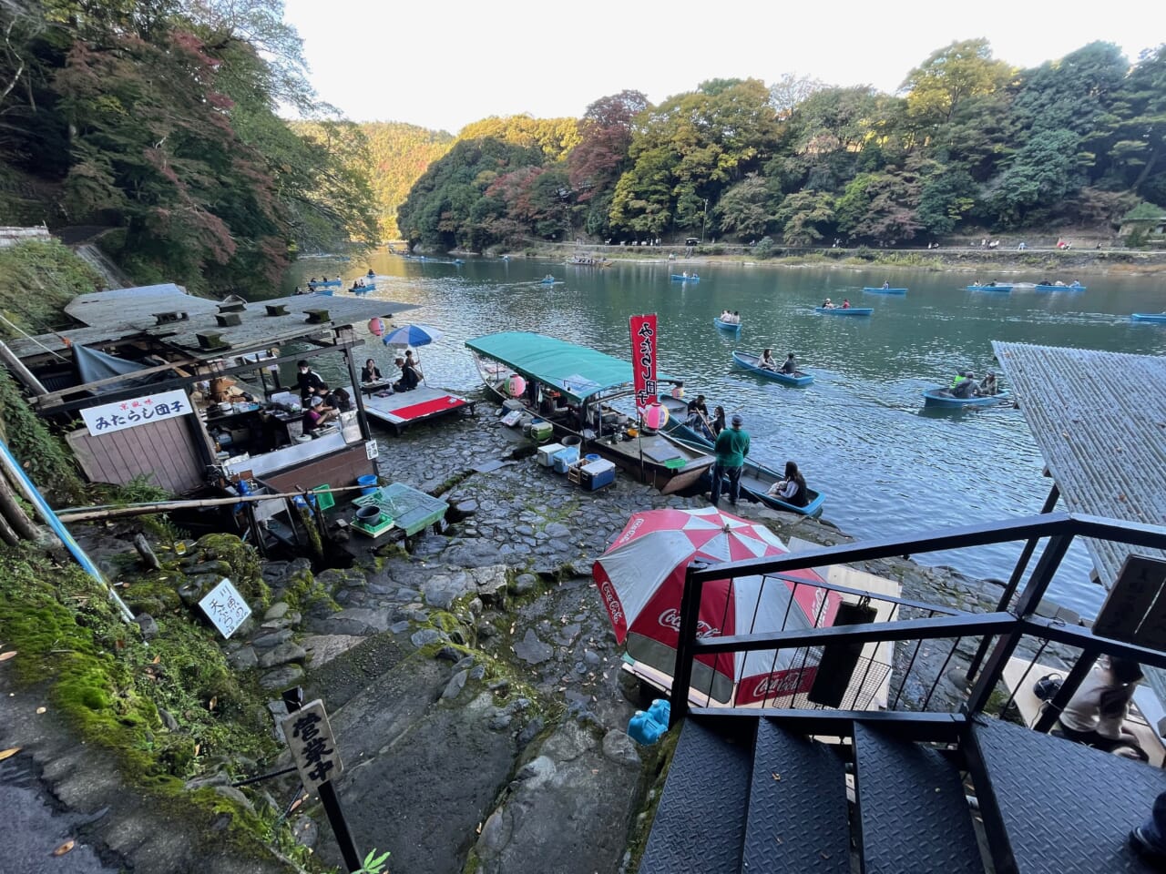 最後にネタばらしになるが、実は、「嵐山」駅からは渡月橋をそのまま渡って陸伝いで来ることもできる。とはいえボートを漕いで飲食するのが絶対に面白く、オススメだ。
