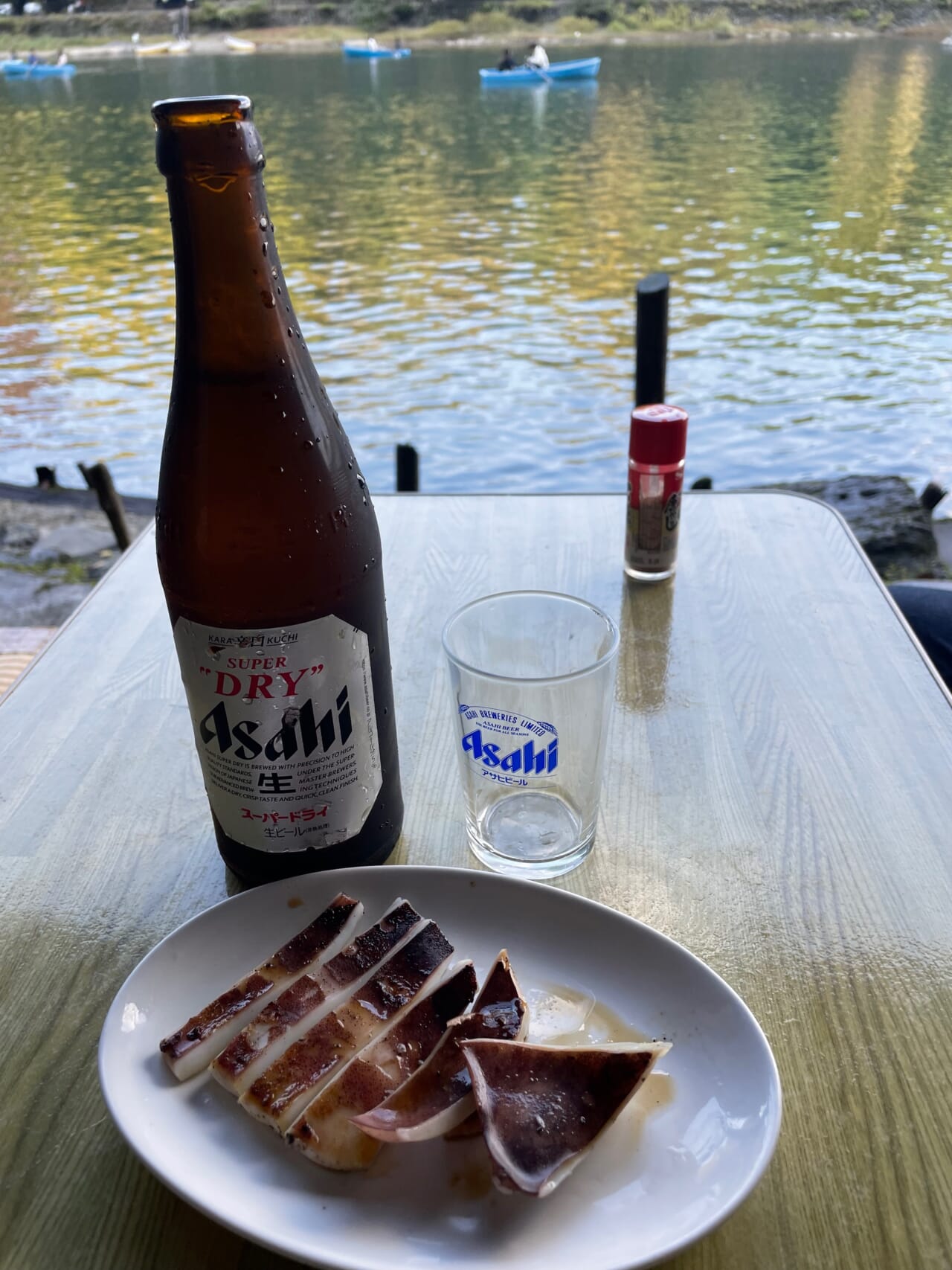 料理とお酒を待つ間、後ろに手をつきリラックスした体勢で反対側の岸をぼんやりと眺めていた。自分はあそこからやって来たんだと考えると、達成感が湧き上がってくる。ふとこちら側の岸に目を向けると、貸しボート向けの販売コーナーで軽食を求めるカップル、家族連れの姿があった。当たり前だが、皆、ボートで“来店”している。