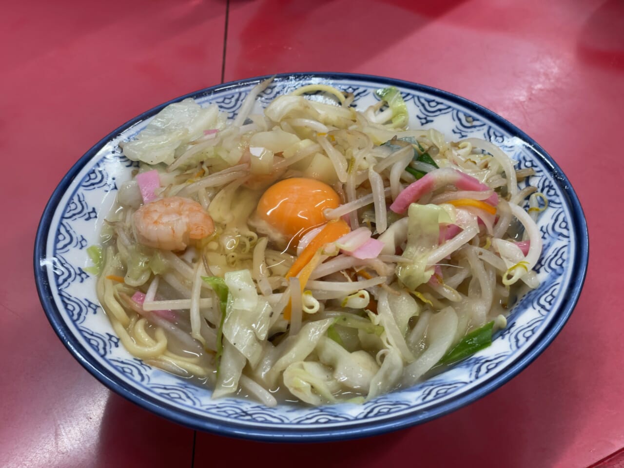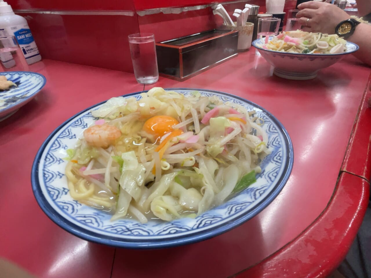 7〜8分後、目の前に料理が置かれる。具材がたっぷりで麺はほとんど見えない。その真ん中に生卵が落とされている。いい感じだ。