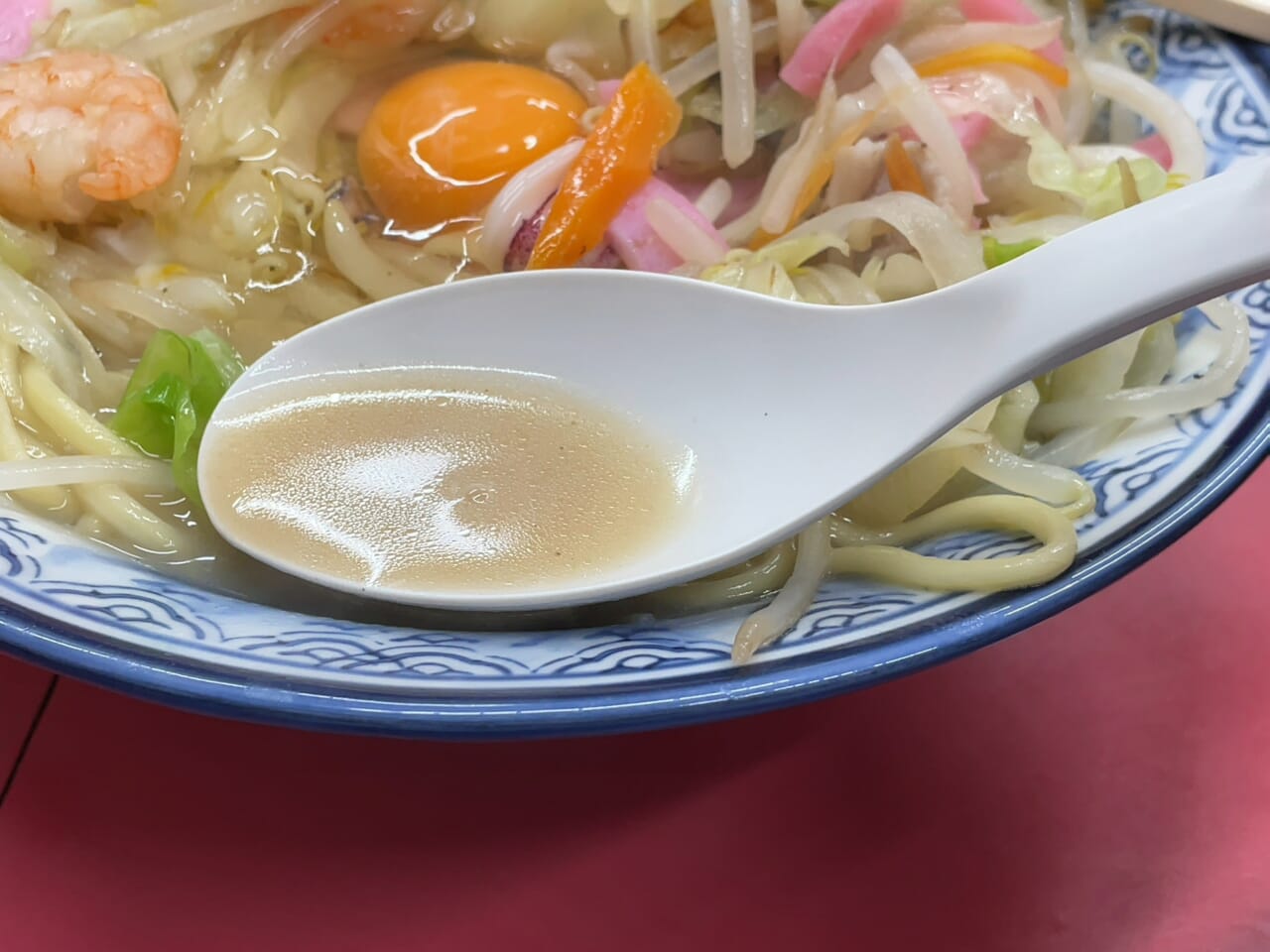早速いただく。まずはスープから。説明書きによると「創業以来半世紀 毎日継ぎ足し守り続けた『自家製スープ』に『名産九十九島カキ』を使用しまろやかに仕上げた『本場長崎ちゃんぽん』です」とのこと。レンゲで少量をすくい、口へ。うん、おいしいぞ。想像よりも薄味ながら味わい深い。