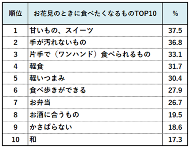 花見といえばお弁当やおにぎりが定番だが、25年は花見グルメに進化がみられ、「手軽さ」「特別感」「SNS映え」を重視したトレンドが台頭している。とくに人気の食べ物として「唐揚げ」「おにぎり」「三色団子」がランクインしており、片手で食べられる手軽さとシェアのしやすさが支持されているとみられる。