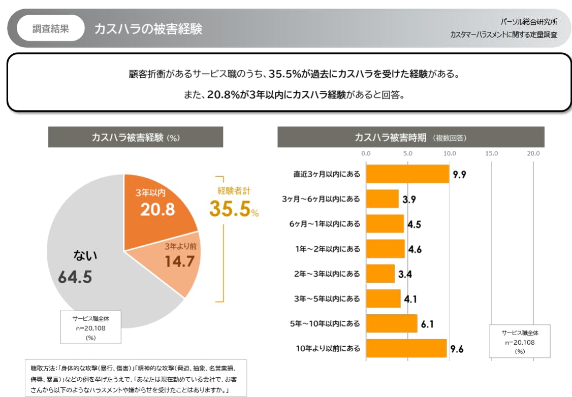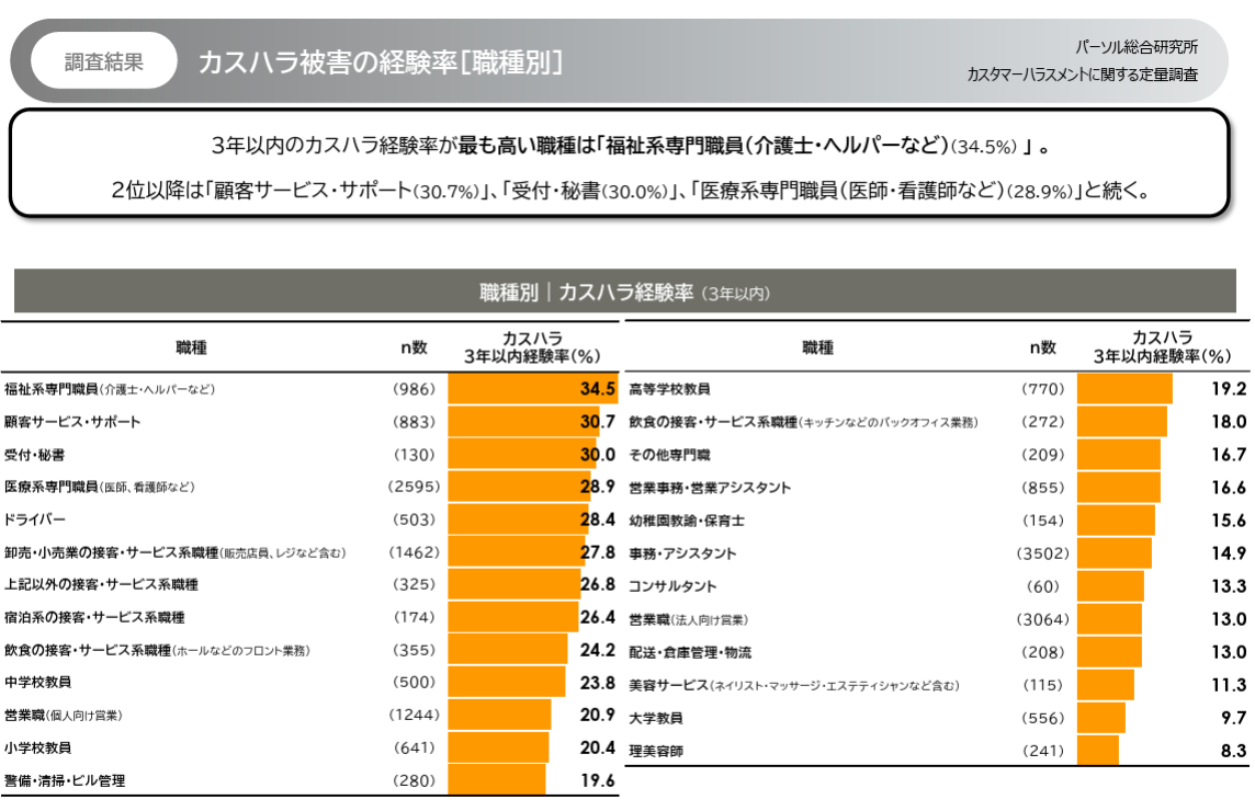 こうした総合支援サービス展開の背景には、深刻化するカスハラの実態がある。パーソル総合研究所(東京都/岩田亮社長)が24年6月に発表した「カスタマーハラスメントに関する定量調査」によれば、サービス業従事者のうち、カスハラの被害を経験した人は35.5%に上る。とくに直近3年以内の被害経験者は20.8%と高く、増加傾向が見られる。業種別では、福祉系職種が34.5%と最も高く、次いで卸売・小売(27.8%)、飲食(24.2%)と、いずれも高い割合となっている。