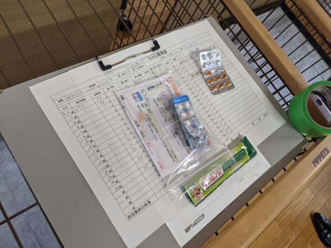 現在の犬齢・猫齢は13~15才。人間でいえば後期高齢者にあたる。そのため、外見でわかる白内障などに限らず、健康に何かしらの課題や病を抱えている。そのため、各犬固有のゲージの上には、毎日の健康状態などをチェックする管理表、処方薬、薬の飲ませ方の説明書などが置いてある。獣医師と提携し、定期的なメディカルチェックも行う。