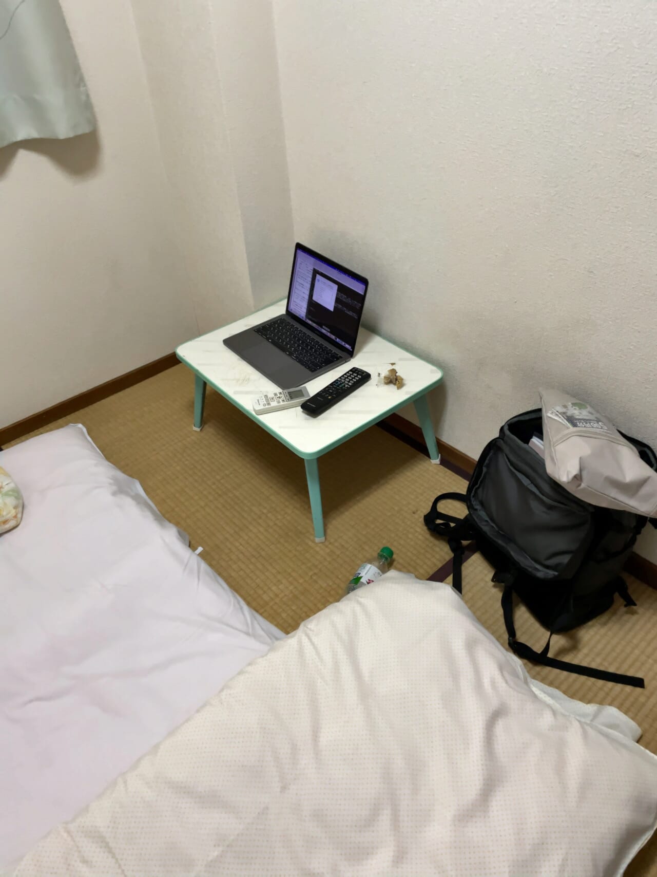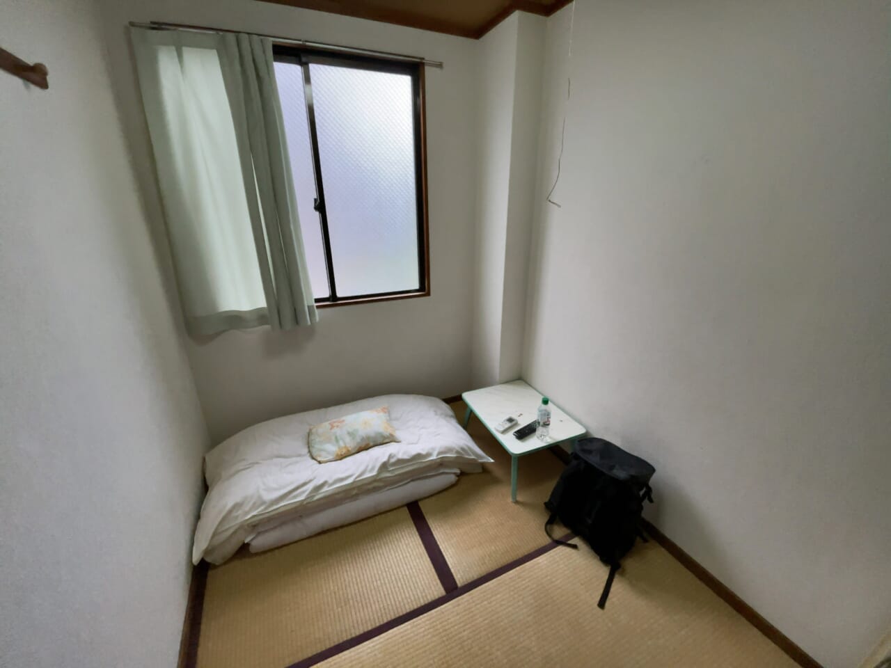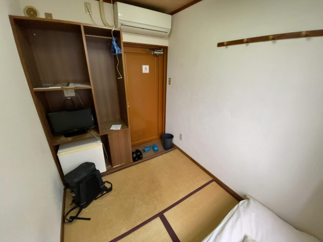 渡された鍵を使い、いよいよ入室する。私の部屋は和室で、畳が縦横に組み合わせてあり広さは3畳。部屋にある設備は、エアコン、テレビ、そして折りたたみ式の小さなテーブルが1台置いてある。やや狭い感じはするが、くつろいで寝るだけならこれで十分だと前向きに解釈する。