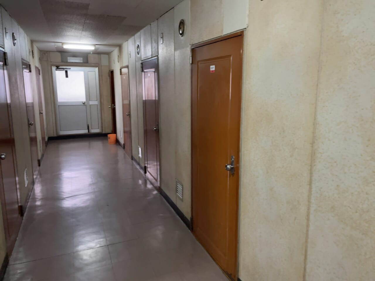 館内は土足厳禁で、これは西成のホテル“あるある”だ。玄関でスリッパに履き替え、靴を手に部屋へ移動するシステムになっている。各部屋の扉は鉄製で、旧式の集合住宅のようである。