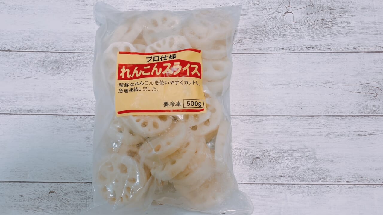 れんこんの面倒な下ごしらえ作業を省略でき、かつ安価に入手できる冷凍の「れんこんスライス」を非常に便利な商品です。冷凍庫に1つ入れておくと、あと一品に困ったときに役立ちます。ほかの食品スーパーにも似たような商品がありますが、近隣に肉のハナマサがあるならぜひ購入してみるのをおすすめします。