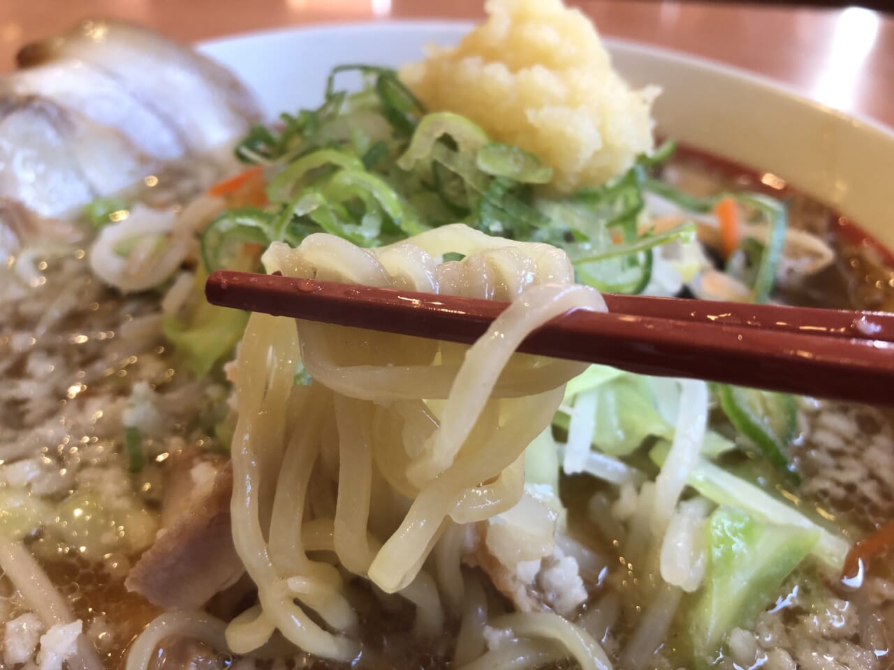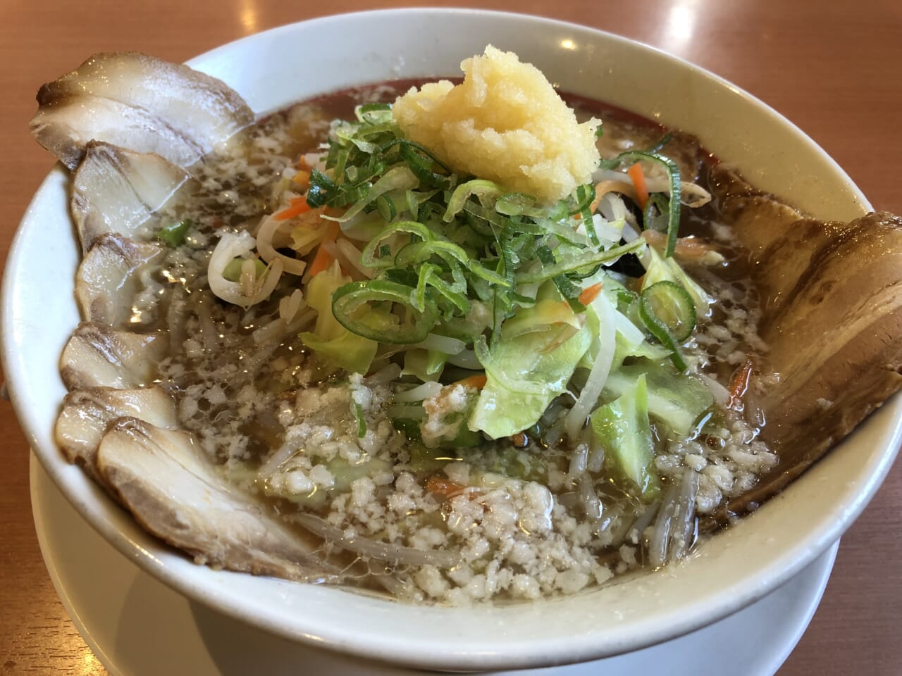具材は、大ぶりのバラチャーシューが6枚、その上に山盛りの野菜、ネギ、ニンニクがトッピングされている。野菜はキャベツ、モヤシ、タマネギ、ニンジン、キクラゲと豊富で、スープには粗めの背脂が浮かび、麺は中太麺を採用している。