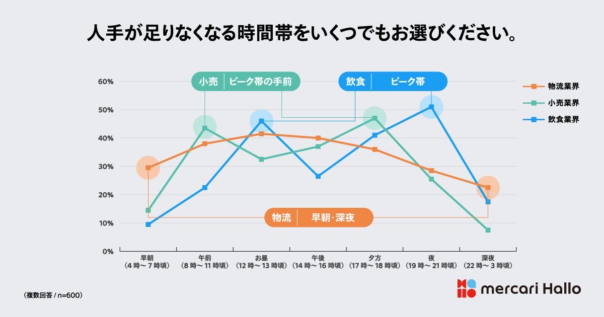 また、業界ごとに人手が求められるタイミングも異なる。物流業界では早朝や深夜、小売業では開店前の品出しや清掃、飲食業ではランチやディナーのピークタイムにスキマバイトの活用が集中している。