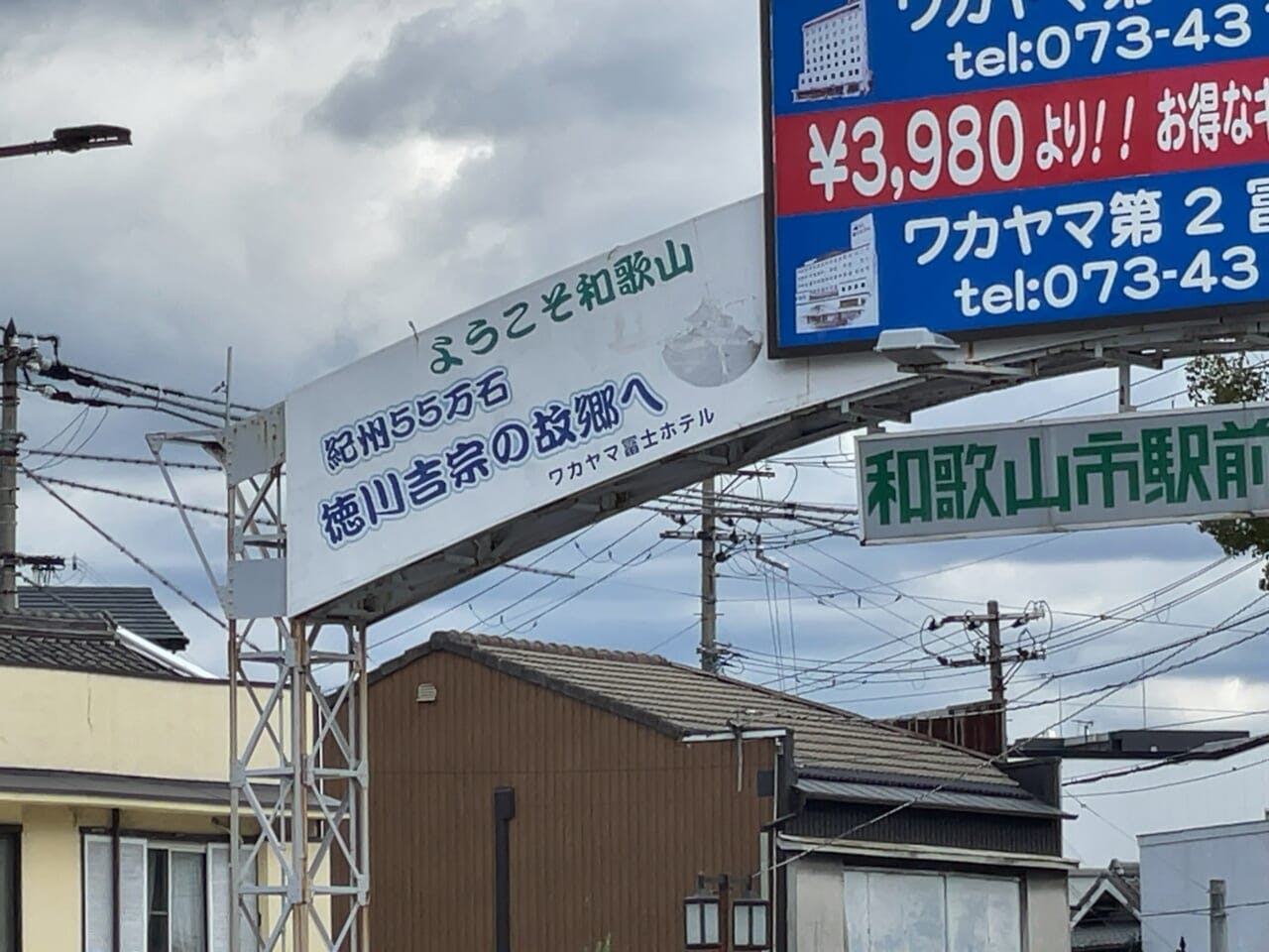 駅前には商店街をアピールするアーチ状の巨大な掲示物が立っている。見上げると一角に「ようこそ和歌山」とともに「紀州55万石 徳川吉宗の故郷へ」と書かれている。「暴れん坊将軍」で知られる吉宗は和歌山出身なんだな。