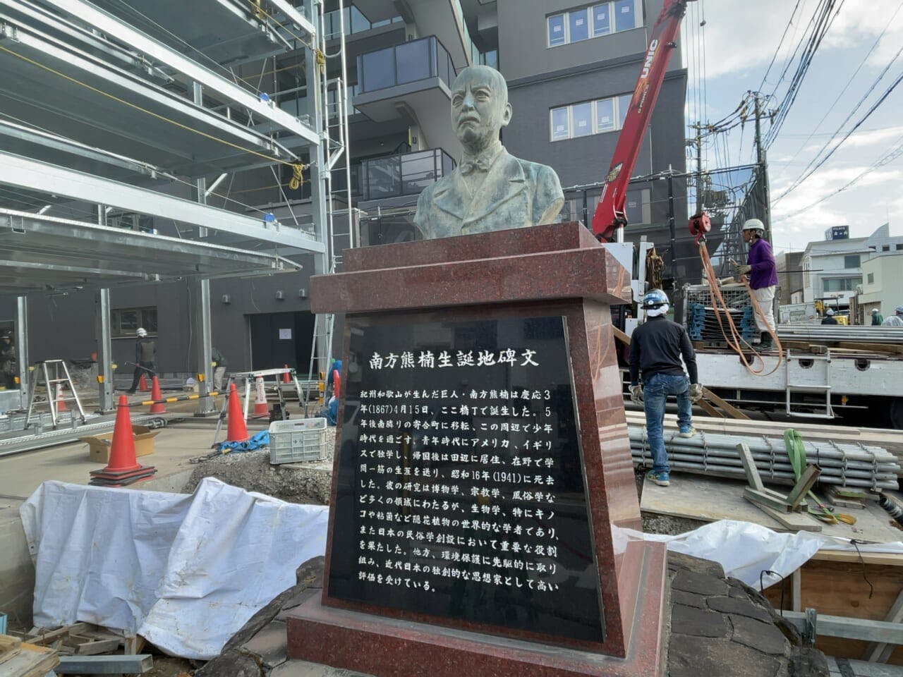 まず向かったのは南方熊楠の記念碑。像のある場所はマンション建設中だった