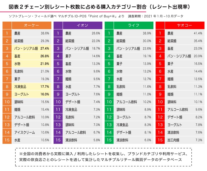 図表2は、各チェーンの購入レシート枚数に対するカテゴリー出現率を表したものだ。「オーケー」は、「パン・シリアル類(27.4%)」「水物※豆腐や納豆などの大豆加工食品(21.9%)」、「乳飲料(21.9%)」、「ヨーグルト(16.0%)」といった購入頻度が高い日配品のレシート出現率が高い。また、「畜産(26.8%)」もよく買われている。