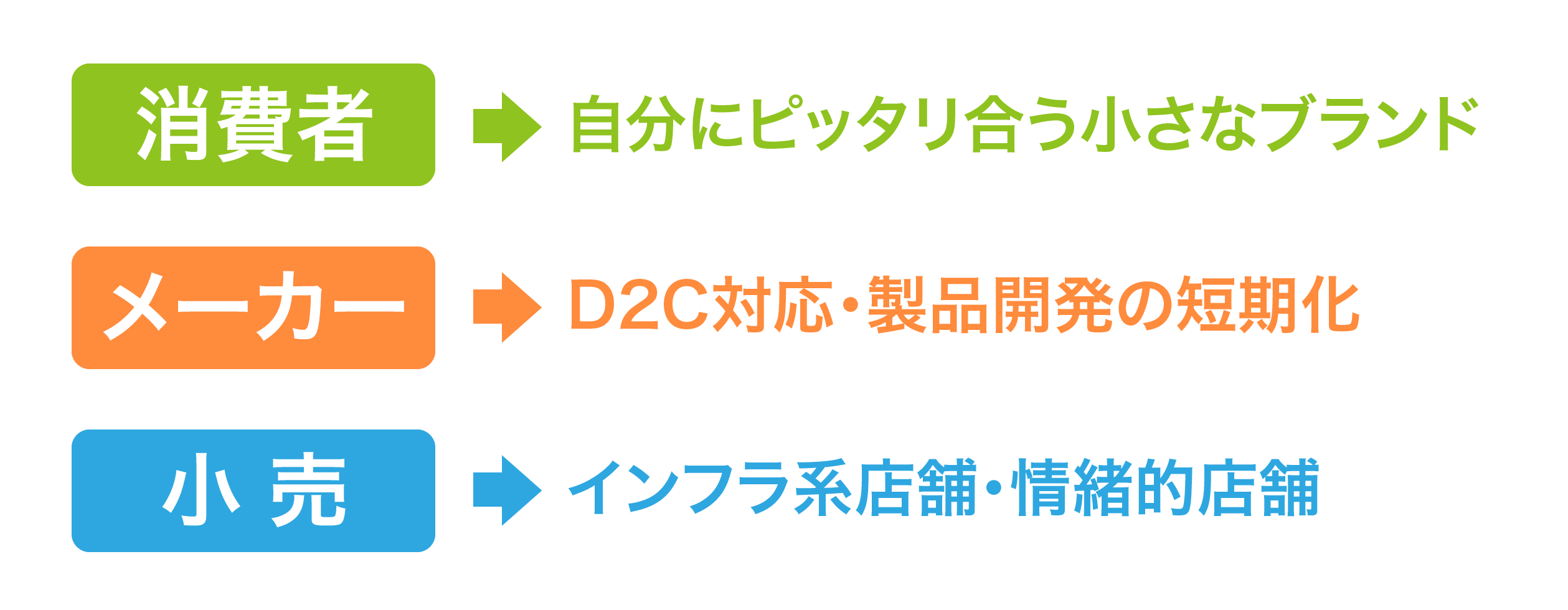 今後10年間で「消費者」「メーカー」「小売」はどう変化するのでしょうか。まず「消費者」の購買行動を見ると、1人1人が豊富な情報から取捨選択を繰り返し、より自分にピッタリ合うブランド・商品を探し求める時代になるでしょう。そうなると、「みんなが持っていてみんなが知っている有名ブランド」というものは、徐々に少なくなることが予測されます。「自分は好きだけど、隣の人は知らない・持っていない」というブランドが乱立するため、1ブランドの規模もだんだん小さくなっていきます。