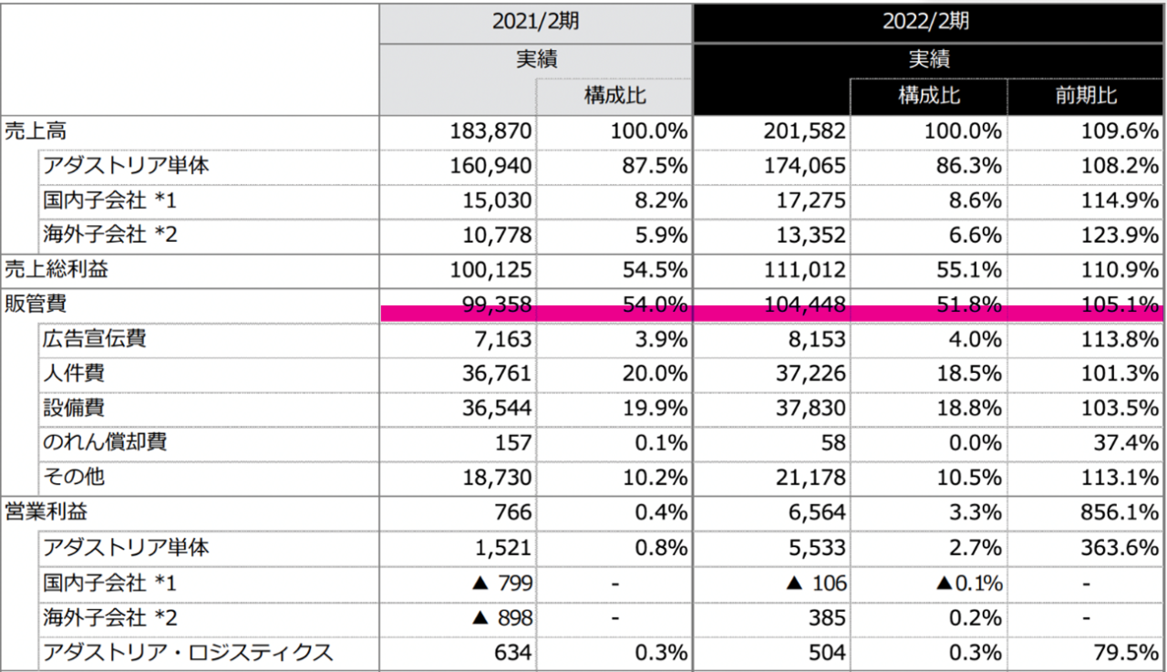 おそらく、一般的な分析でいえば、ここでg.u.や中国市場の施策などを深掘るのだろうが、私はここで驚いたのは、同社の販管費の低さである。同社の国内市場での販管費は21年度上期、22年度上期通して30%台だ。同社の売上は、2兆円なので、ちょうどその1/10の2000億円企業であるアダストリアの販管費と比較してみれば、その差は歴然だ。