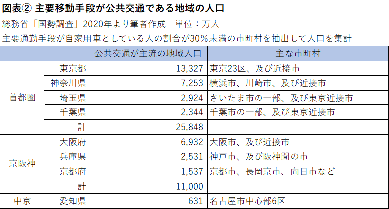 こんなデータがある。国勢調査では、主な通勤移動手段を市町村別に調査しており、クルマを主要手段とする割合が3割未満の市町村を抽出してみると、首都圏では16号線内側エリアに似た地域となり、その合計人口は2584万人に達する(図表②)。同じ条件を京阪神で抽出すると合計人口は1100万人となり、一定規模の「内側マーケット」があることがわかる。しかし、3大都市圏でも、中京圏では名古屋市は中心6区63万人しかなく、ほぼクルマ社会になっていることがわかる。オーケーが主要攻略エリアとして設定する「16号線内側」と同じ構造のマーケットは首都圏以外では関西しかないことがおわかりいただけるだろう。