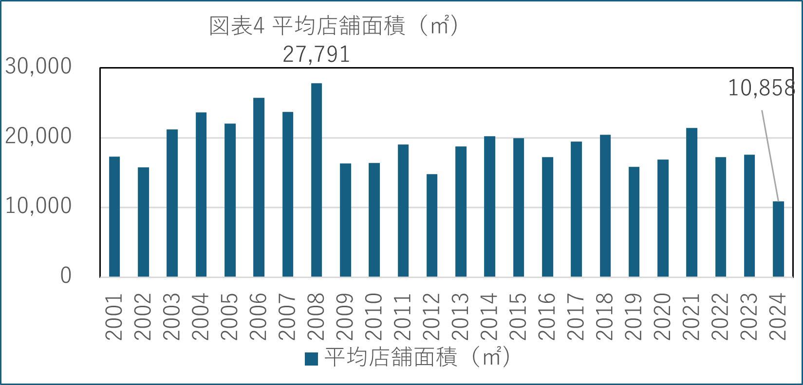 工事費の高騰や少子高齢化による市場の縮小を背景に、新規開業SCの平均面積も縮小している。近年、SCの利回りが他の不動産用途に比べ劣後することから、開発の複合化も増加。その結果、「オフィスの足元商業」「下駄履きマンション」などの下層階物件が増加している。
