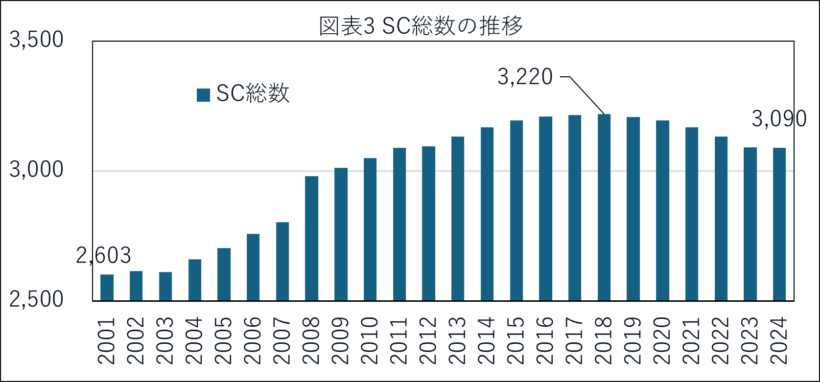 以上の結果、24年のSC数は、23年の3092カ所から2SC減り、3090カ所となった(図表3)。総数は19年から6年連続で減少している。