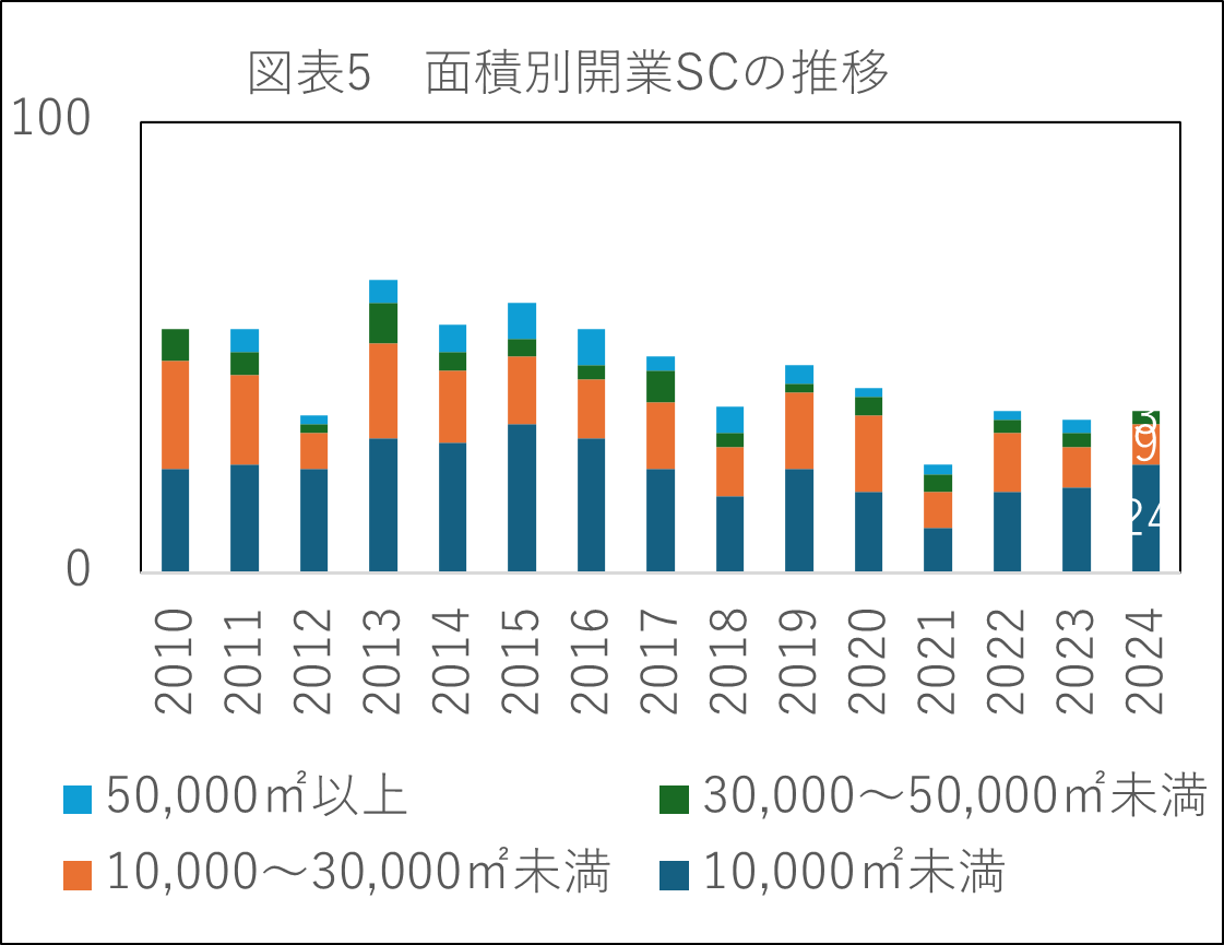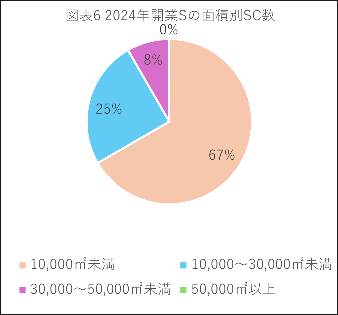 次に開業したSCの面積別推移を見ていきたい。24年の開業SCの平均面積は、1万858㎡とこれまでと比べ大きく減少した(図表4)。その要因として、5万㎡以上のSCの開業が無かったこと、また開業SCの約7割が1万㎡未満だったことが指摘できる(図表5、図表6)。