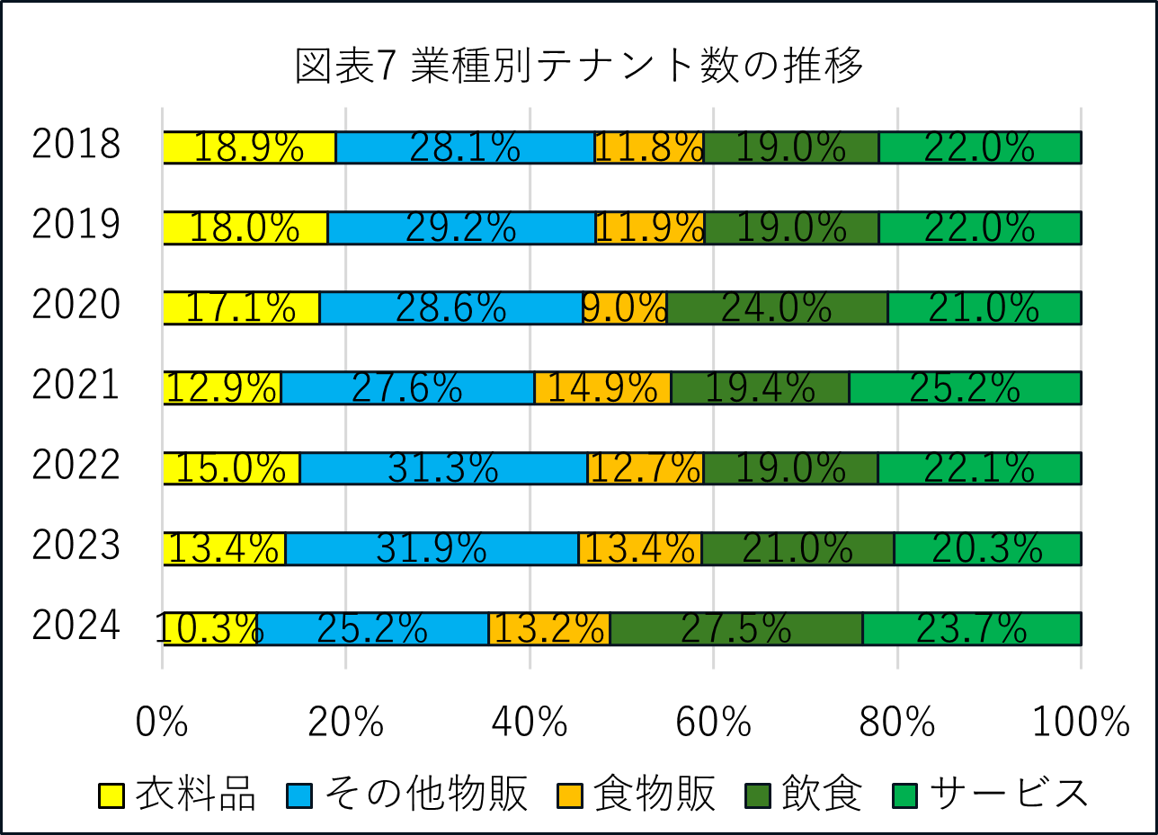 SCに出店するテナントの業種別店舗数割合は、近年の少子高齢化を色濃く反映している。24年に開業したSCでは、衣料品10.3%、その他物販25.2%、食物販13.2%、飲食27.5%、サービス23.7%となり、テナント店舗数の半数以上は非物販となっている(図表7)。今後、賃料負担率の低下は避けられないだろう。